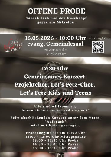 die wir dann am Abend um 17:30 Uhr zusammen mit den Sängerinnen und Sängern des Let's Fetz-Chores im Rahmen eines Konzertes in der evangelischen Kirche vortragen. Die Songs werden mit Noten gesungen, d.h. die Liedtexte müssen nicht auswendig gelernt werden.